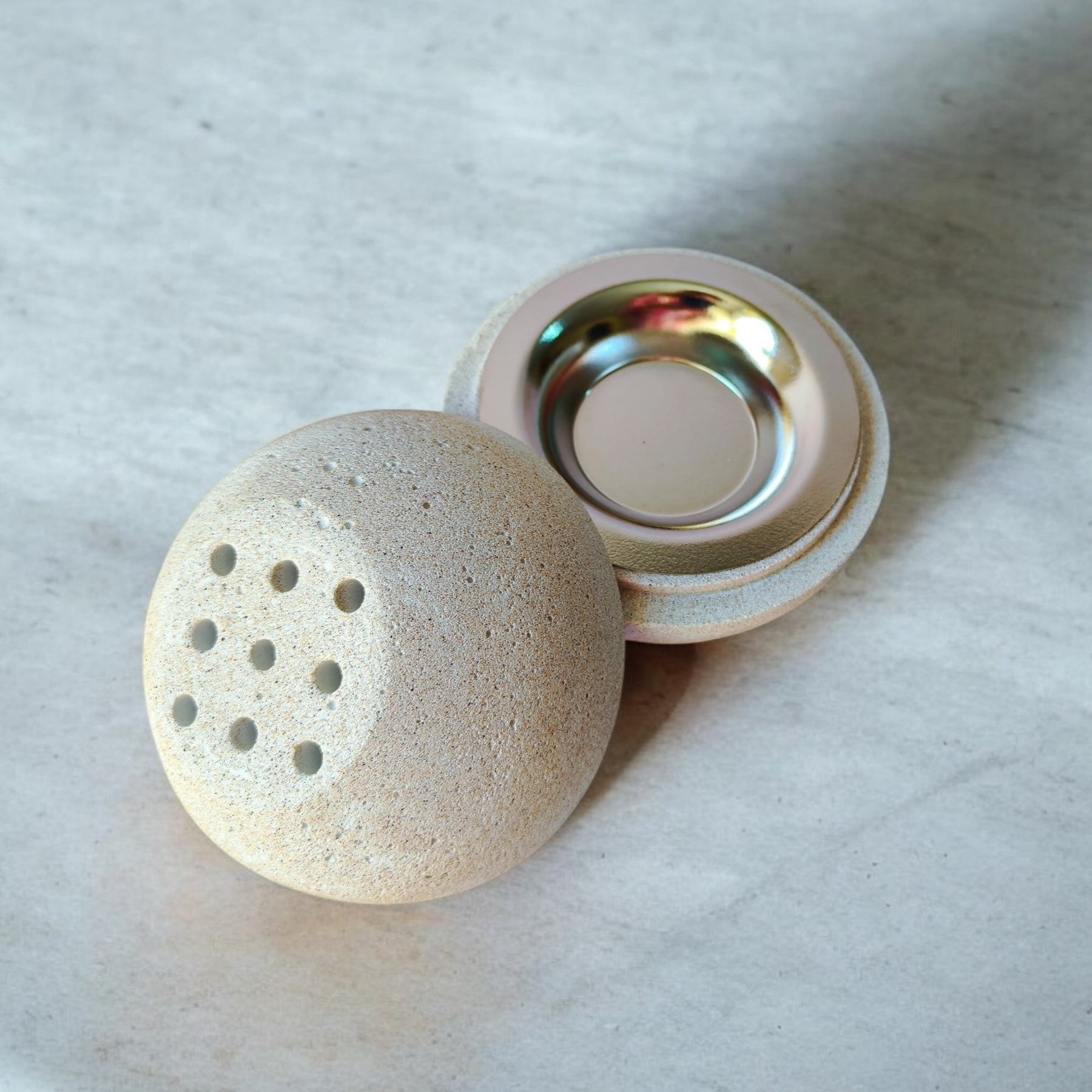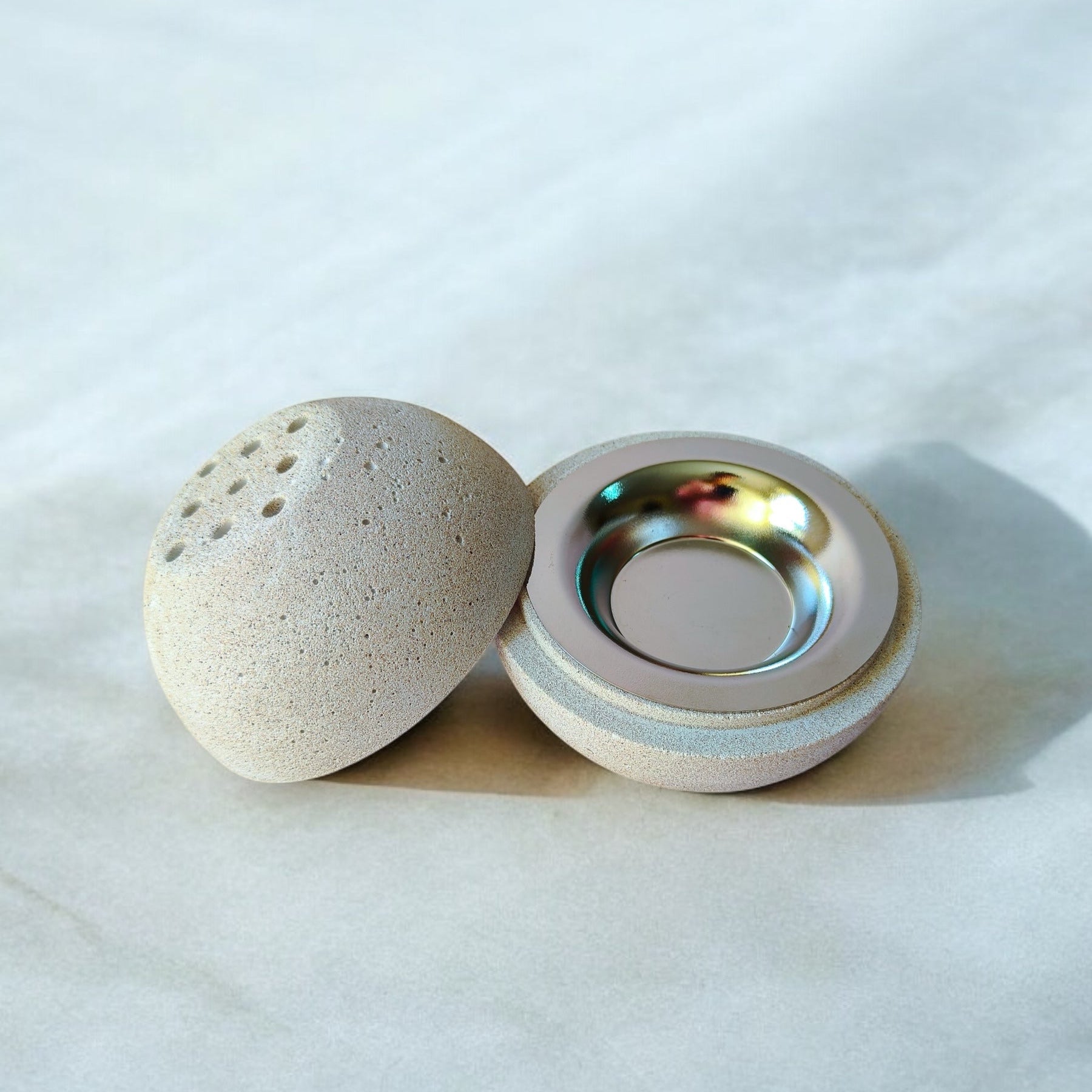 Introducing the Timeless Madkhan, a beautifully crafted piece that seamlessly blends art, utility, and safety. Made from stone-textured Jesmonite, this elegant oval-shaped Madkhan is not just a decorative item—it's a functional treasure for your home.